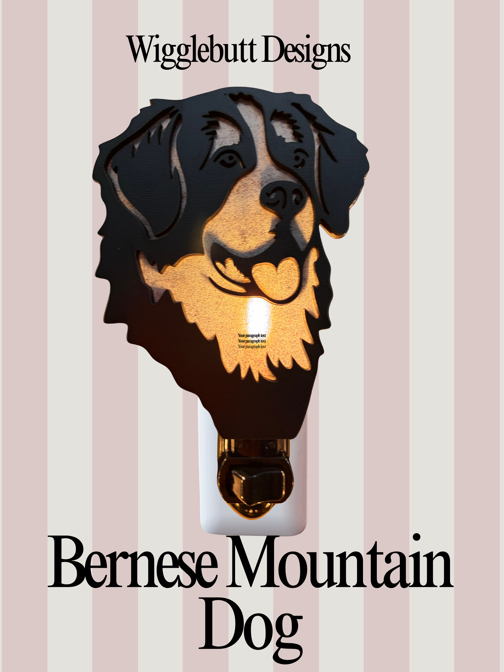 Illuminate your space with the gentle glow of our Burnese Mountain Dog Night Light. This charming accent piece features a detailed silhouette of a loyal Bernese Mountain Dog, casting a warm, soothing light perfect for bedrooms, nurseries, or any room needing a cozy touch. The soft illumination creates a calming atmosphere while celebrating your love for this beloved breed. Energy-efficient LED technology ensures long-lasting performance without excess heat. A thoughtful gift for dog lovers and a delightful addition to any home décor.